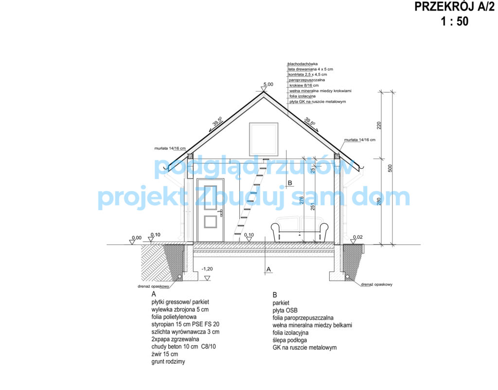 Projekt domu z antresolą to budynek murowany, brak stropu, strop wbudowany w środek w konstrukcji szkieletowej, tak samo ściany działowe. Ściany w projektowanym budynku z bloczków gazobetonowych 18cm na zaprawie cienkowarstwowej. Ściany zewnętrzne docieplone styropianem gr 10 cm. Budynek ten może pełnić funkcję jako dom letniskowy na zgłoszenie, bez pozwolenia na budowę, całoroczny lub jako dom do ciągłego mieszkania dzięki ociepleniu.